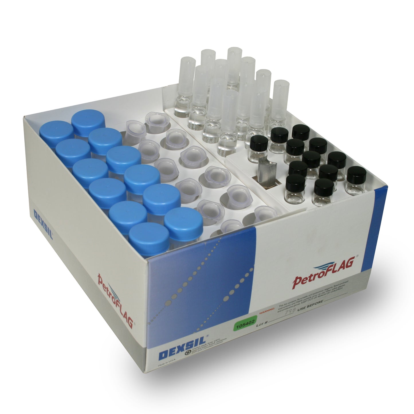 1000 ppm Calibration Standards (white capped vials) for use with the PetroFLAG analyzer are available by boxes of 12; includes plastic tubes, filters, and developer vials.