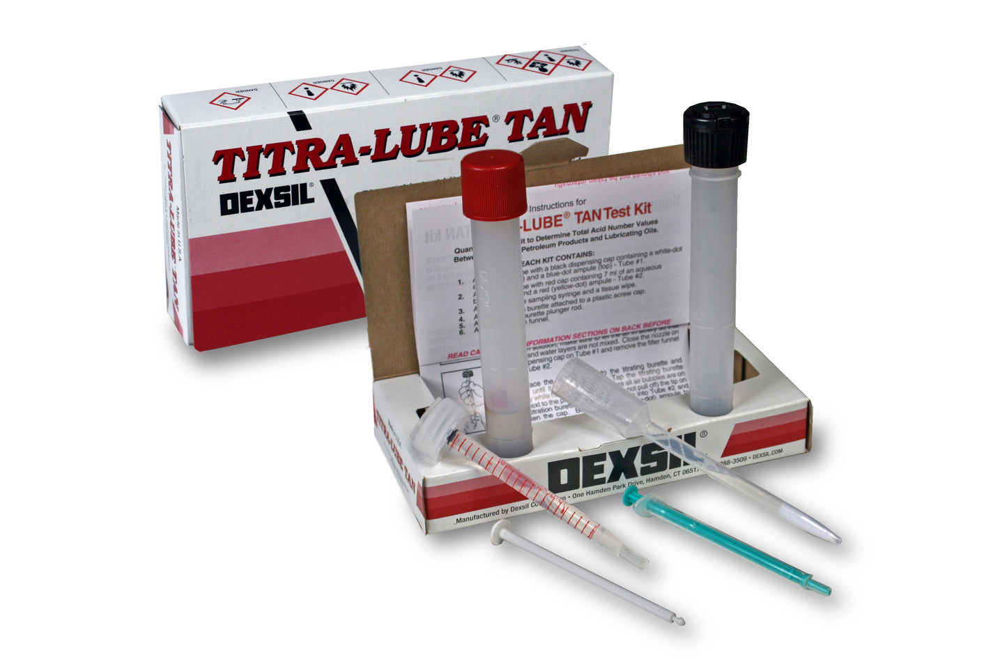 Titra-Lube TAN contains no "F" series solvents. All premeasured reagents are non-hazardous and sealed in glass ampules for consistent, accurate results. Oil color will not interfere with the test because the colorimetric end point is carried out in the aqueous phase. The test covers the range of 0-2 TAN units (mg KOH/gram of oil) and comes complete with everything necessary to perform one test.